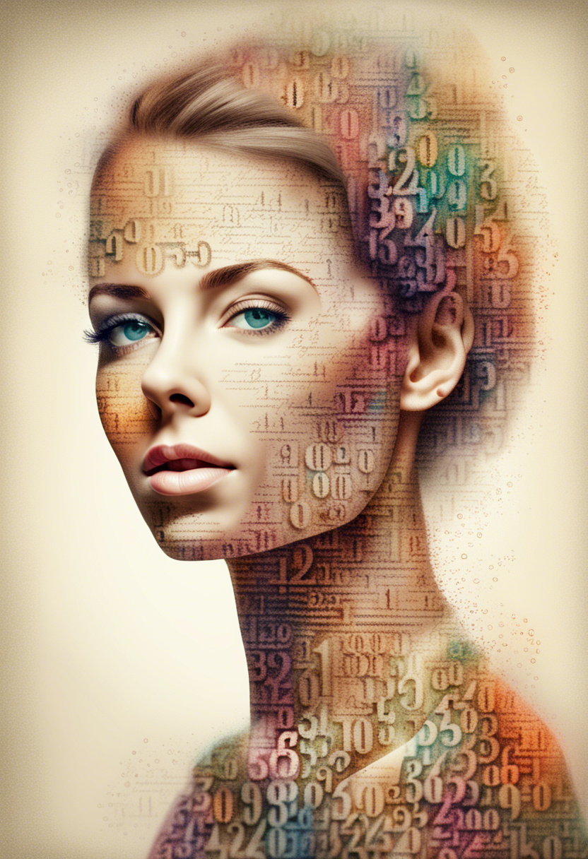 Beautiful woman portrait composed entirely of letters and numbers colorful, soft colors